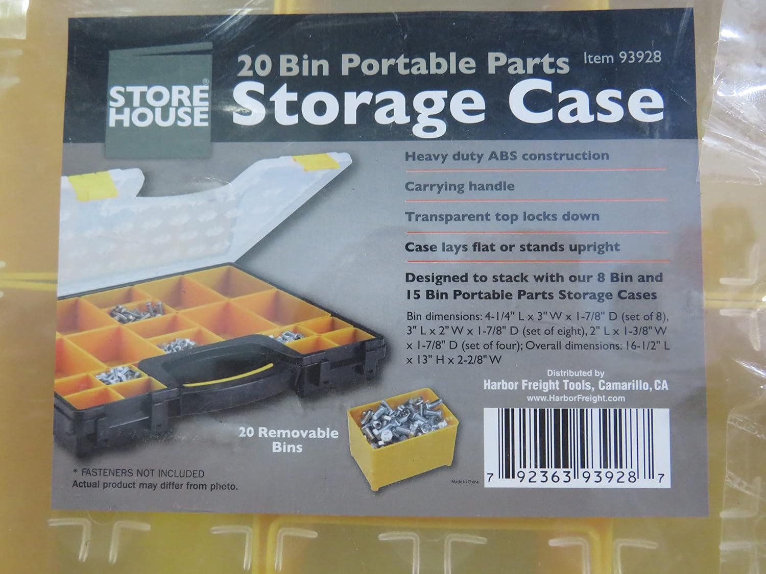 20 Bin Portable Parts Storage Case - Harbor Freight Tools Product Overview. This storage case stands alone or stacks with our other portable parts storage cases. This case is made from heavy duty polypropylene with removable bins and a quick-view transparent top. 20 removable bins. Transparent quick-view top locks down, keeps contents in place. Built-in carrying handle. Case lays flat or stands upright.